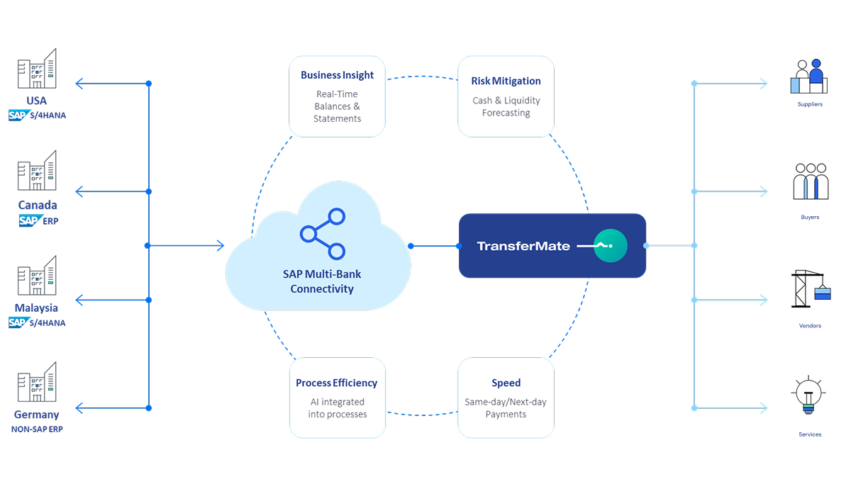 - TransferMate acts as the execution partner, with transaction data flowing back into SAP for visibility and automated reconciliation